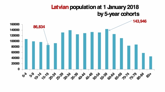 Un tagad smagā artilērija… Ja skatāmies uz darba tirgu, sadalot 25–64 gadus vecos iedzīvotājus 5 gadu intervālos, tad katrā piecgades intervālā ir vidēji 120–130 tūkstošu cilvēku (piemēram, 25–29 g. v. intervālā — 130 tūkstošu, 30–34 g. v. intervālā — 140 tūkstošu utt.). 15–19 un 20–24 gadu veco iedzīvotāju, kuri patlaban ienāk vai drīzumā ienāks darba tirgū, intervālā šobrīd ir 80–86 tūkstoši (!) cilvēku; tad atkal būs neliels pieaugums (0–4 g. v. — mazliet vairāk par 100 tūkstošiem). Tuvāko 15 gadu laikā problēma tikai padziļināsies.