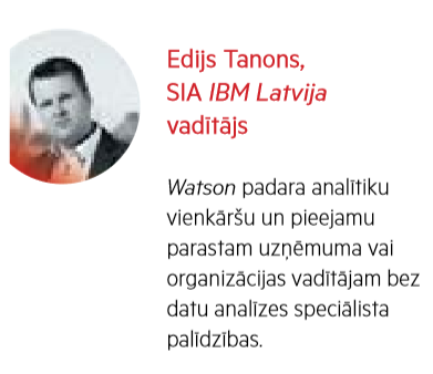 Daudziem IBM vārds ir saistīts ar mākslīgā intelekta rīku Watson, kas kļuva pazīstams, uzvarot sāncenšus (cilvēkus) ar zināšanām saistītā ASV televīzijas spēlē Jeopardy! 2011. gadā. Starplaikā Watson t. s. izzinošās skaitļošanas (cognitive computing) programmatūra ir pielāgota dažādiem lietojumiem, arī biznesā noderīgajam Watson Analytics, kas spēj veikt biznesa un procesu datu analīzi. Turklāt, kā skaidro E. Tanons, Watson padara analītiku vienkāršu un pieejamu parastam uzņēmuma vai organizācijas vadītājam bez datu analīzes speciālista palīdzības. Watson Analytics mākonī pagaidām darbojas angļu valodā, pieslēdzot risinājumam uzņēmuma datu kopas, var palūgt informāciju, piemēram, cik preču pēdējā pusgadā ir pārdots sievietēm starp 18 un 25 gadu vecumu, cik nodoto kravu ir saņemts ar kavēšanos (pēc valstīm un pilsētām), cik bezdarbnieku pēc apmācības pavāra kursos saņem darba piedāvājumus, kur tas ir un ar kādu iesācēja algu. Analīzes rezultātus var apskatīt viegli saprotamos grafikos.