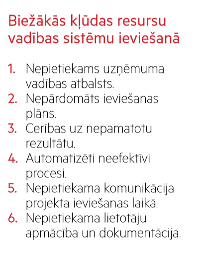 ASV bāzētā resursu vadības sistēmu ieviešanas kompānija Panorama Consulting Solutions, kuras klienti ir izkaisīti pa visu pasauli, katru gadu veic ERP sistēmu pētījumu. Šāgada pētījuma dati liecina, ka uzņēmumi bieži vien nenovērtē sistēmas ieviešanai nepieciešamos resursus un pieļauj kļūdas projektu realizācijā. Ceturtā daļa aptaujāto ir atzinuši, ka sistēmas ieviešana viņu uzņēmumos ir bijusi neveiksmīga. Turklāt vairumā gadījumu ieviešanas izmaksas ir izrādījušās lielākas, nekā uzņēmums sākotnēji bija plānojis, pati ieviešana – laikietilpīgāka, taču reālais ieguvums no sistēmas ieviešanas ir sajusts nebūt ne otrajā dienā, bet ar zināmu laika atstarpi. Lai no neveiksmēm izvairītos, ir svarīgi sistēmas ieviešanu uzticēt pieredzējušam uzņēmumam, kā arī rēķināties, ka projektam būs nepieciešams zināms laika un prasmju ieguldījums arī no uzņēmuma darbiniekiem.
