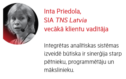 „Mūsu pieredze rāda, ka integrētas analītiskas sistēmas izveidē būtiska ir sinerģija starp pētnieku, datu apstrādes speciālistu jeb programmētāju un vizuālistu jeb mākslinieku,” saka SIA TNS Latvia vecākā klientu vadītāja Inta Priedola. „Pētnieka loma ir būtiska, lai datu vizualizācija būtu korekta un sniegtu vajadzīgās atziņas un interpretāciju. Programmētāja loma – nodrošināt spēcīgu algoritmu datu automātiskai apstrādei. Savukārt māksliniekam vizualizācija ir jāpadara viegli uztverama un intuitīvi pārvaldāma.”